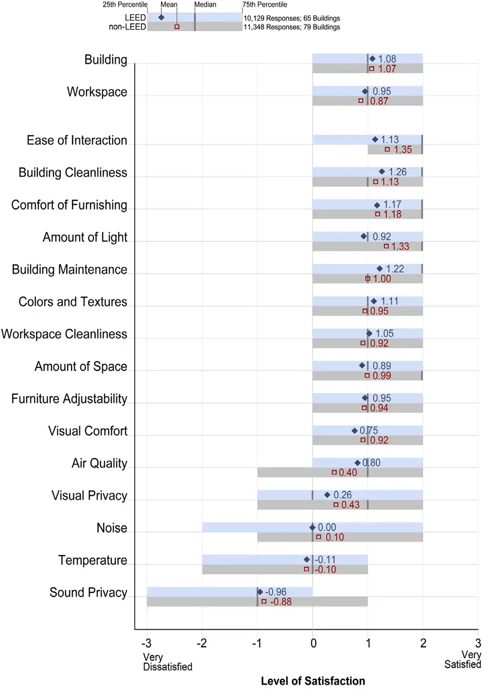 W 2013 r [1] przeprowadzono badania w 144 budynkach biurowych i przebadano aż 21 477 osób przebywających na co dzień w tych budynkach. Niektóre biurowce wykonane były zgodnie z zasadami LEED a inne bez tego certyfikatu. 76% z przebadanych biur były to biura otwarte. Badanie miało na celu porównanie warunków pracy w budynkach, a także sprawdzenie, czy budynki z certyfikatem LEED zapewniają lepsze warunki wewnątrz pomieszczeń, czy też nie. Rys. 1 pokazuje wyniki otrzymane w tym badaniu.