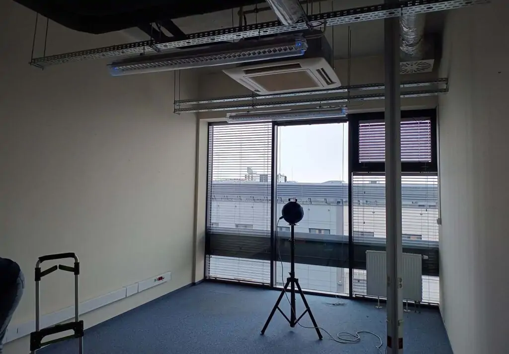 Inwestor zwrócił się z prośbą o przeprowadzenie operatu akustycznego dla projektu przebudowy budynku biurowego położonego w bezpośrednim sąsiedztwie lotniska. Zmiana układu funkcjonalnego oznaczała, że większość ścian wewnętrznych przewidziano do wyburzenia, a w ich miejsce planowano nowe przegrody. W związku z tym kluczowym zadaniem było określenie parametrów izolacyjności akustycznej przegród, które pozostały w budynku, aby potwierdzić ich przydatność w nowym układzie funkcjonalnym. Szczególnym obszarem analizy stała się zewnętrzna ściana budynku – fasada. Należało precyzyjnie ustalić jej izolacyjność akustyczną w kontekście narażenia na podwyższone poziomy hałasu lotniczego.
